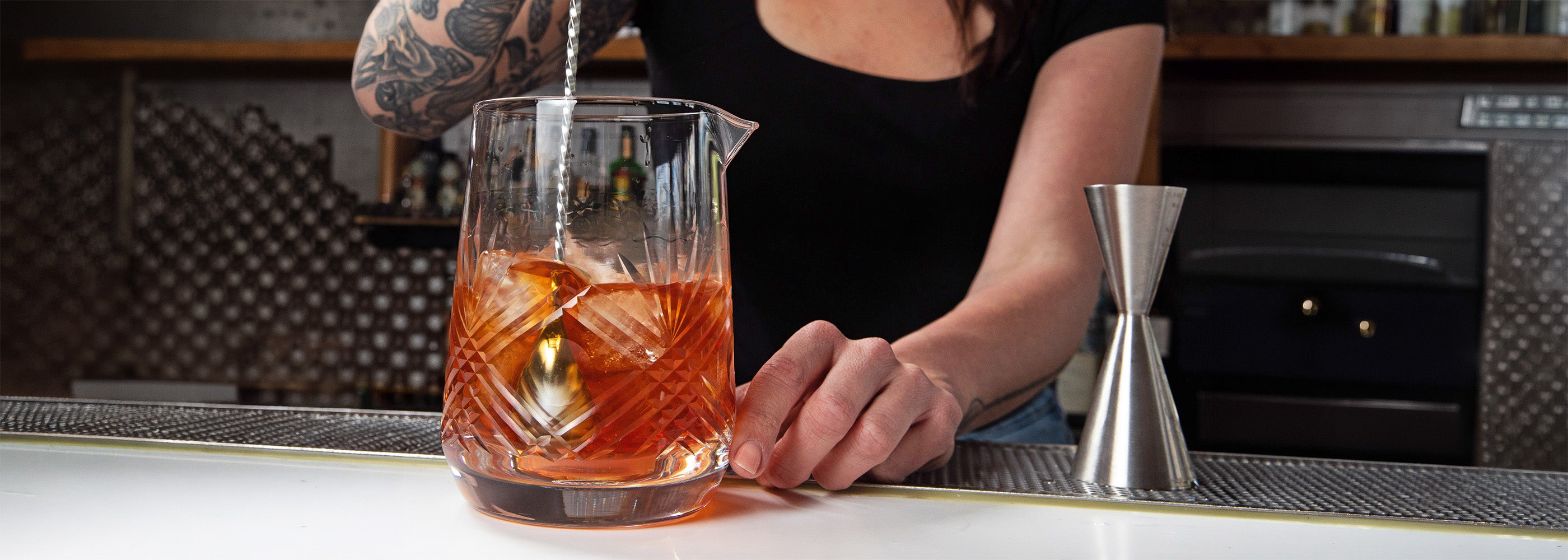 The smooth interior surface allows bar spoons to glide effortlessly for a quiet, consistent, and controlled stir.